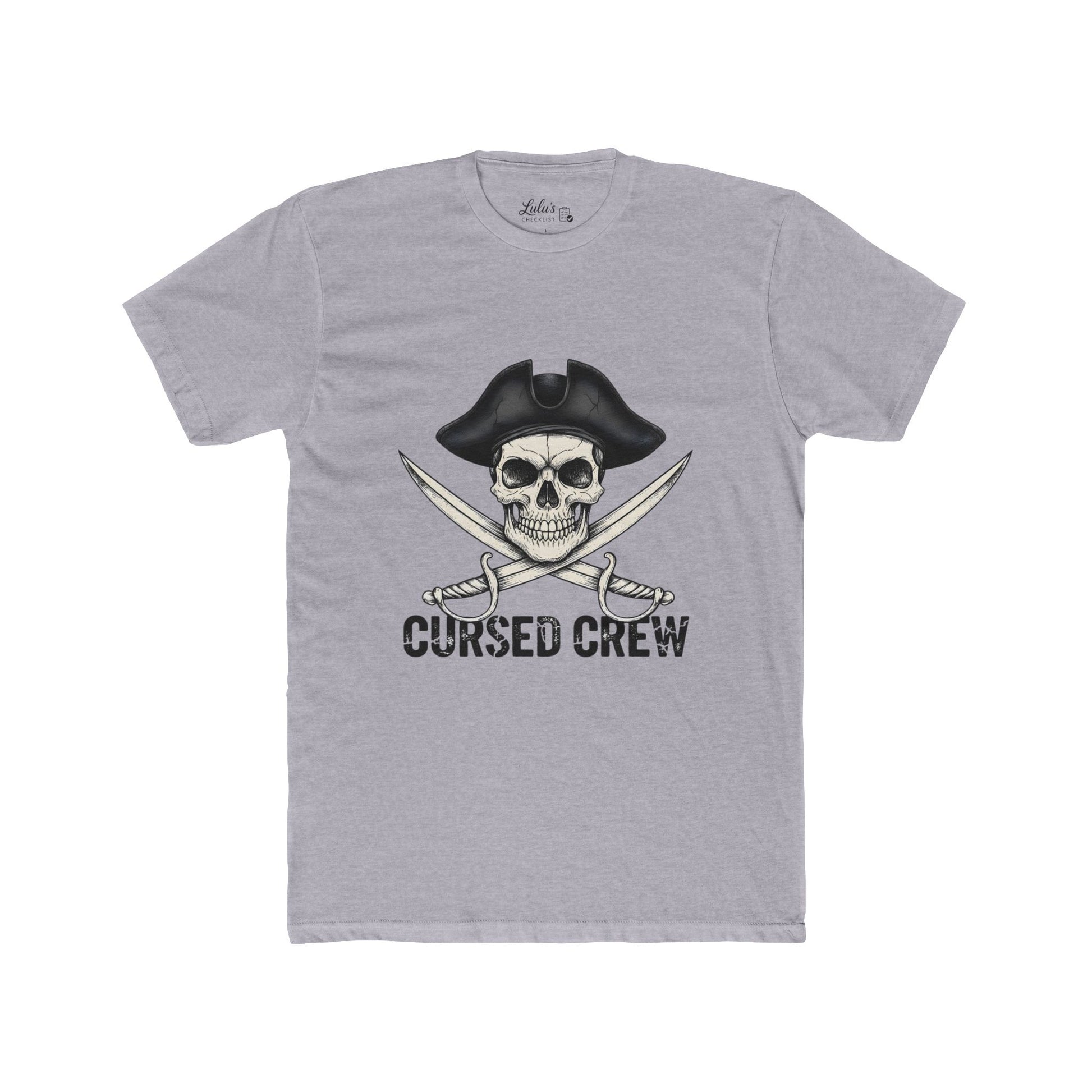 This lightweight cotton crew tee wears like a page from a salty sea tale. A weathered skull in a tricorn hat stares out from the chest, flanked by crossed cutlasses and stamped with the words “Cursed Crew.” The art carries an aged, hand-inked look — gritty but deliberate — that reads like a pirate’s emblem pinned to a favored jacket. Wear it on cool mornings at the harbor, layered under a denim overshirt, or tossed on for nights around a bonfire where folk songs and tall tales rule. The classic crew collar and clean side seams keep the silhouette tidy while the soft, breathable fabric moves with you on long walks along the pier or during a weekend of ship-model building and rum-tasting gatherings. This tee speaks to those who favor stories with salt on their lips and history in their pockets.